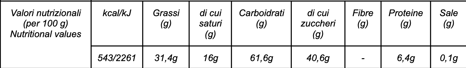 Ingredienti: Crema Vegetale alla Nocciola 44% (Zucchero, Olii vegetali (Olio di Girasole, Olio di Palma, Olio di Cocco)), Nocciole 14%, Cacao magro in polvere, Latte scremato in polvere, Emulsionante: E322 lecitina di soia; Aromi), Biscotto 44% (Farina di grano tenero di tipo 00, Margarina Interamente Vegetale (Grassi (Palma), Oli (Girasole)), Zucchero, Uova Fresche Intere Pastorizzate, Aromi), Cioccolato Fondente 11,8% (Massa di cacao, Zucchero, Grassi Vegetali Idrogenati, Burro di Cacao 16%, Emulsionante: E322 Lecitina di Soia; Estratto di Vaniglia), Nocciola Tostata 0,2%.