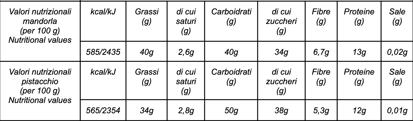 Ingredienti: Mandorla: mandorla a fette, sciroppo di glucosio, zucchero, grasso vegetale (palma), destrosio, latte intero in polvere, emulsionante: lecitina (di soia).