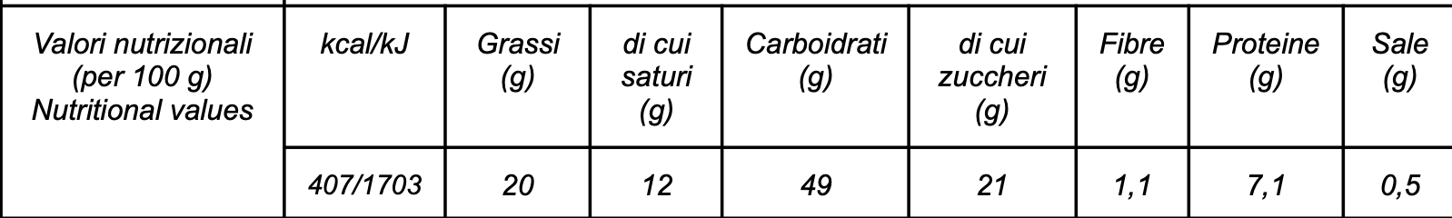 Ingredienti: Farina di grano tenero tipo 0, zucchero, fruttosio, lievito madre naturale (frumento), mono- e digliceridi degli acidi grassi, latte magro in polvere, sale, acido ascorbico, burro, burro liquido, burro di cacao, uova intere di galline allevate a terra di categoria A, zucchero, miele millefiori di Sicilia, pasta di arancia, sale, bacche di vaniglia del Madagascar.