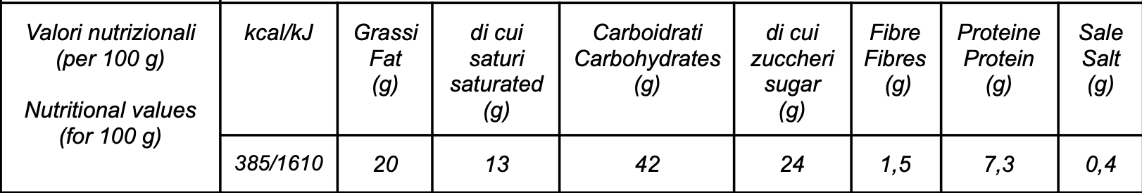 Ingredienti: Farina di grano tenero tipo 0, zucchero, lievito madre naturale (frumento), sale, acido ascorbico, gocce al caramello salato (sciroppo di glucosio, latte intero in polvere, creme fraiche d’isigny A.O.P., burro salato d’isigny A.O.P. 3,6%, sale di Guerande 1,2%, emulsionante: lecitina di colza), burro, burro liquido, tuorlo d’uova di galline allevate a terra di categoria A, panna fresca, miele millefiori di Sicilia, pasta d’arancia, bacche di vaniglia del Madagascar.