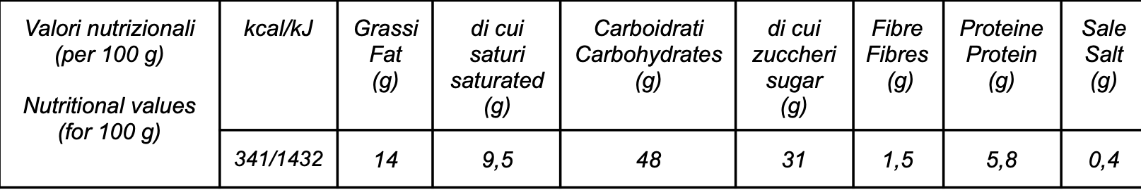 Ingredienti: Farina di grano tenero tipo 0, zucchero, lievito madre naturale (frumento), sale, acido ascorbico, mela e cannella semi-candita, burro, burro liquido, tuorlo d’uova di galline allevate a terra di categoria A, zucchero, miele millefiori di Sicilia, panna fresca, sale, bacche di vaniglia del Madagascar.