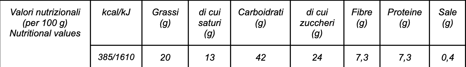 Ingredienti: Farina di frumento tipo 0, zucchero, fruttosio, lievito madre naturale (frumento), mono-e digliceridi degli acidi grassi, latte intero in polvere, sale, acido ascorbico, gocce di cioccolato fondente, gocce di cioccolato bianco, burro, burro liquido, tuorlo d’uova di galline allevate a terra di categoria A, miele millefiori di Sicilia, pasta gianduia (nocciola), pasta di arancia, panna fresca, cacao in polvere, bacche di vaniglia del Madagascar.