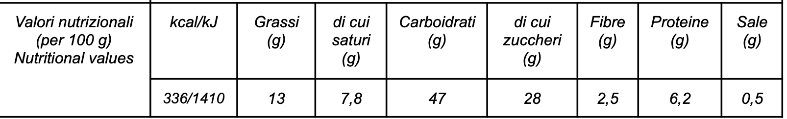 GLASSA ESTERNA: Glassa alle mandorle e nocciole (zucchero, albume, farina di mandorle e nocciole).