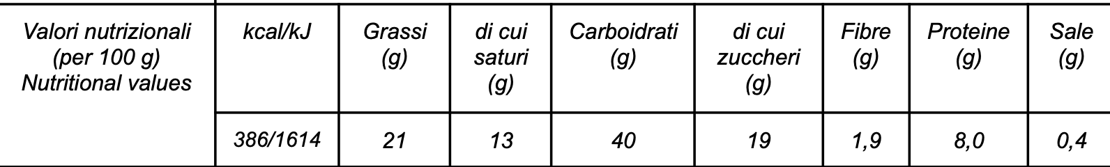 Crema spalmabile alle nocciole (30%): Zucchero, grasso vegetale (girasole), biscotto finemente sbriciolato 12%, farina di frumento, burro concentrato, latte scremato in polvere, farina di malto d’orzo, sale, nocciole, cacao magro al 10/12% di burro di cacao, emulsionante lecitina (di soia), aromi naturali, antiossidante (estratto di rosmarino), nocciola selezionata 30%.